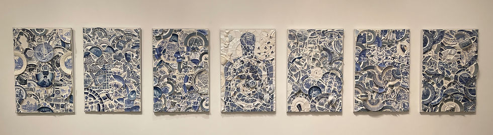 Rend and Remember is a seven panel mosaic comprised of blue and white souvenir state plates, commemorative Mother's Day plates and antique dishes, made with violence and lament. For years when people saw my work, they declared, "Oh, you must be getting your frustration out, just smashing up dishes." I decided to feel the start this project by doing just that: smashing dishes with force and violence, letting out my anger and grief over gun violence, immigration injustice, and the lack of support for mothers in a country that swears it is pro-life. I climbed a ten foot ladder and filmed the process of letting my most beautiful and old dishes fall and shatter in the center of a shooting target. The fact that a human body-shaped shooting target can be purchased nonchalantly from Amazon for a few bucks, and shipped in two days or less to your doorstep is surreal. In the falling twilight that night, I got down on my knees and glued the pieces where they fell on the substrate I laid out on my driveway.